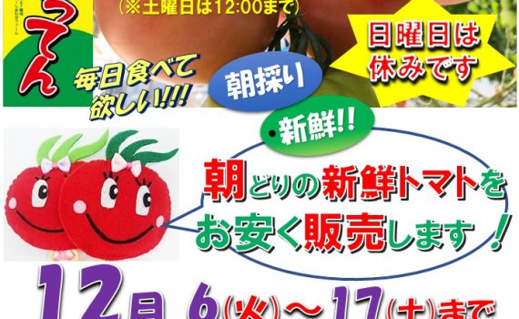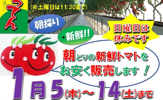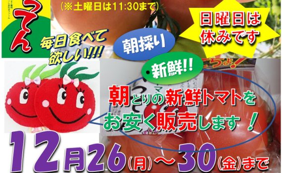新年あけましておめでとうございます。本年も頑張って美味しいトマトを届けていきます。 さて今年も毎年恒 […] イベント おいしいトマト お知らせ しあわせファーム 販売について 🍅年始の売り出しのご案内🍅